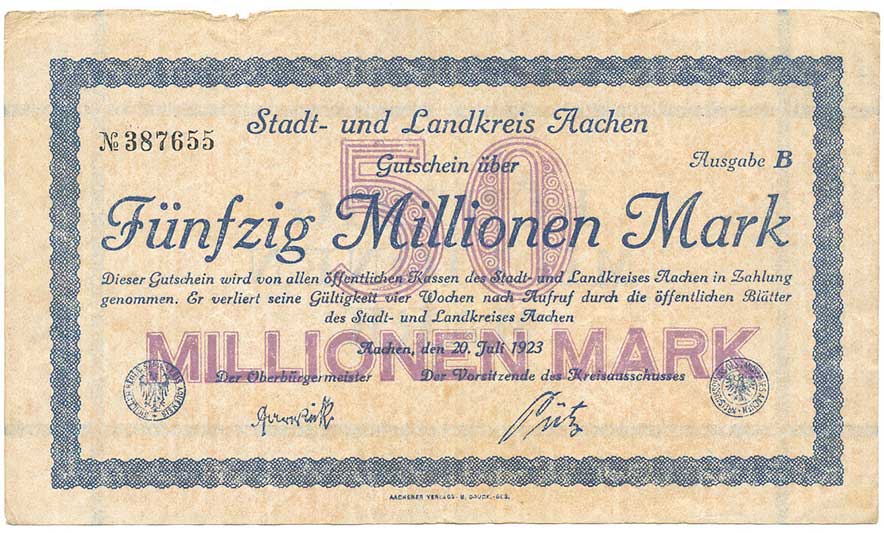 | 2131. | 50 000 000 Mark 20.Juli 1923, Aachen | 3- | 50,- | 50,- |