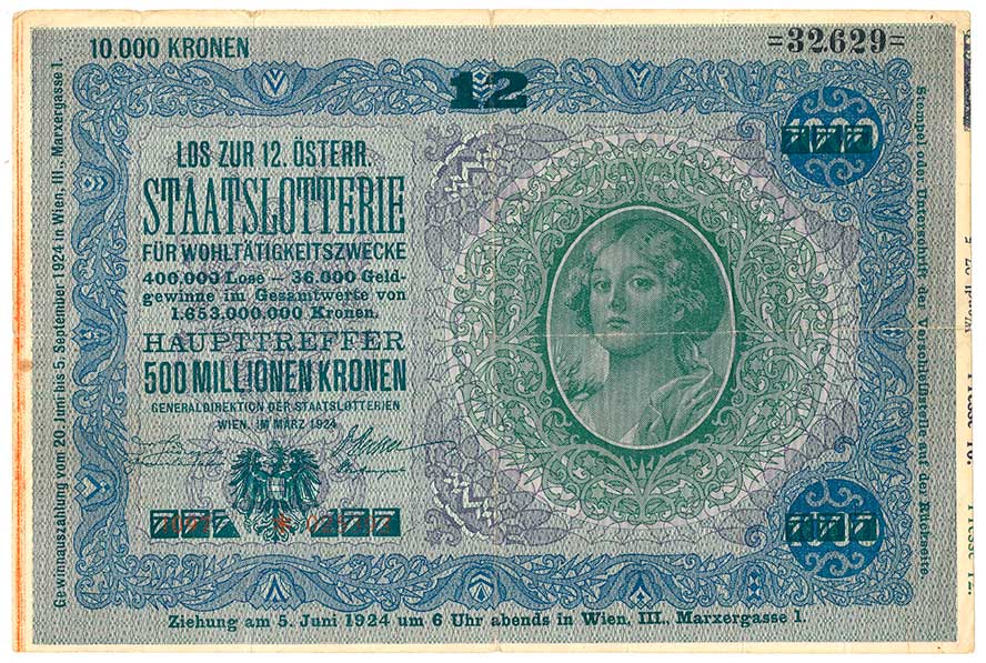12.Státní loterie 1924, na Rv.kulaté nečitelné razítko Vídeň xyz?? |