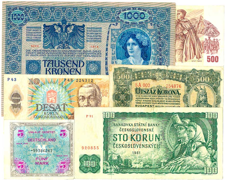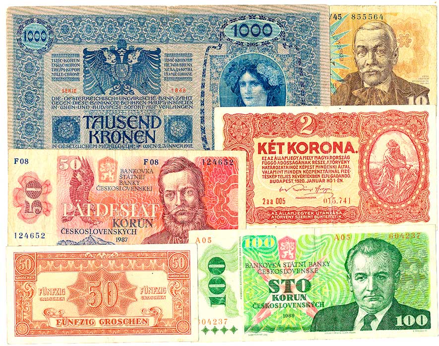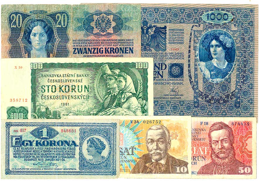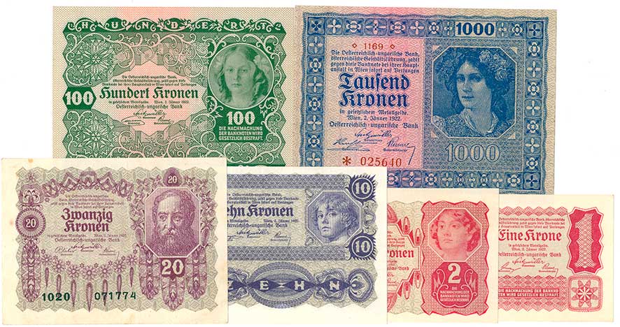| 2134. | 1,2,10,100,1000 Kronen 1922 (N), 20 Kronen 1922 (1, skvrnky), 6ks | - | 100,- | --.- |