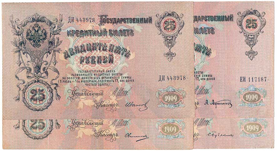 | 2150. | Rusko - 25 Rubl 1909, různé podpisy, 4ks | 2-3 | 120,- | 120,- |