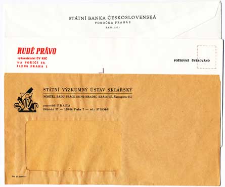 | 2177. | Obálky: Státní výzkumný ústav sklářský HK, pracoviště PHA + Rudé právo,