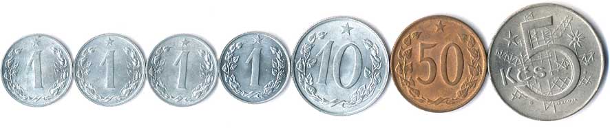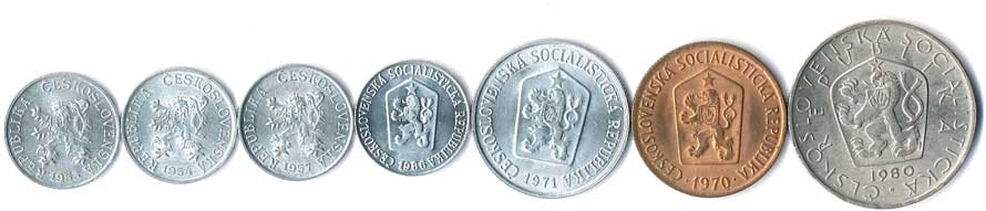 406. 1 haléř 1953,54,57,86, 50 haléř 1970, 10 haléř 1971, 5 Kčs 1980, 7ks 0/0 90,- 100,-