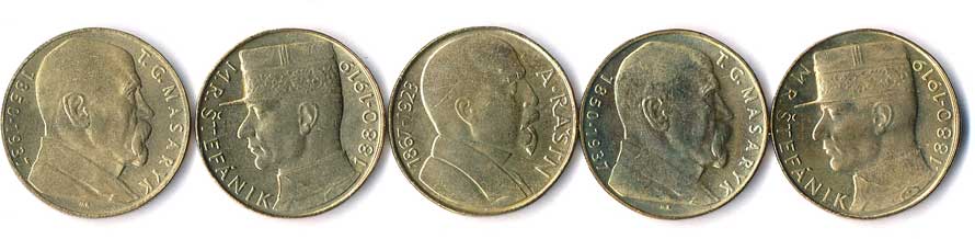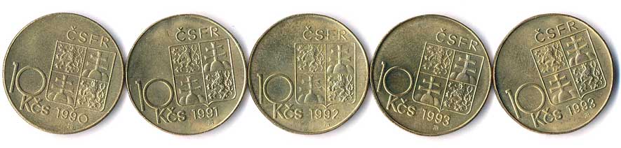 419. 10 Kčs 1990 až 1993, TGM, Štefánik, Rašín, komplet, 5ks 0/0 160,- 180,-