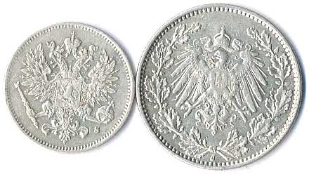 818. 25 Penniä 1915, 1/2 Mark 1914 J, 2ks 1-1- 120,- 120,-