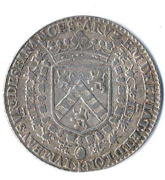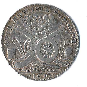 korunovaný erb, kolany, opis / dvě děla, sudy s prachem, koule, dole 1630, Ag27