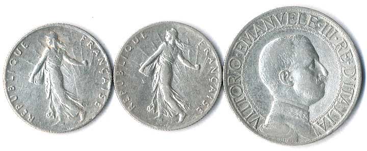 843. 1 Lira 1913, Francie, 50 Centimes 1917,1918, 3ks 1-1- 250,- 250,-