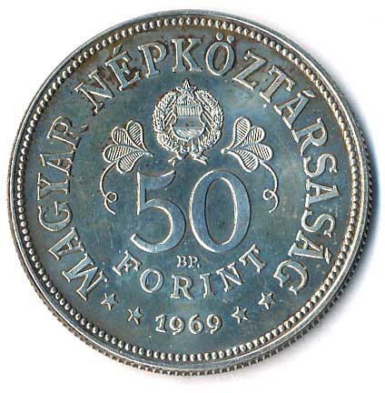 876. 50 Forint 1969, 50.výr.vyhlášení Maďarské republiky, Ag 0/0 3200,- --.-