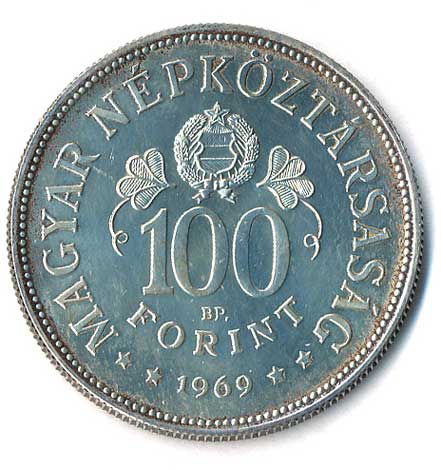 878. 100 Forint 1969, 50.výr.vyhlášení Maďarské republiky, Ag 0/0 420,- --.-