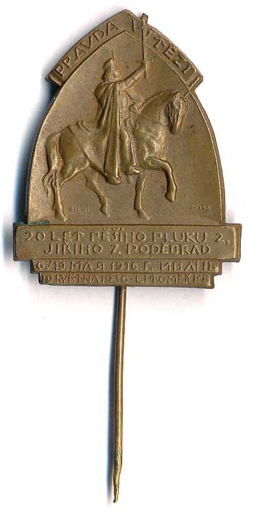 | 1106. | 20 let Pěšího pluku 2. Jiřího z Poděbrad, Jiří na koni, nápisy, plech ŽK28x35 | 1 | 250,- | --.- |