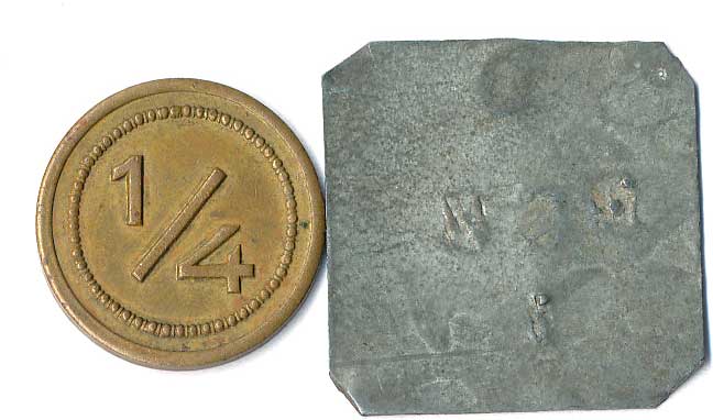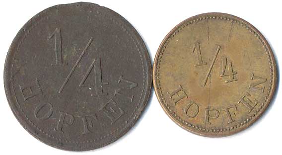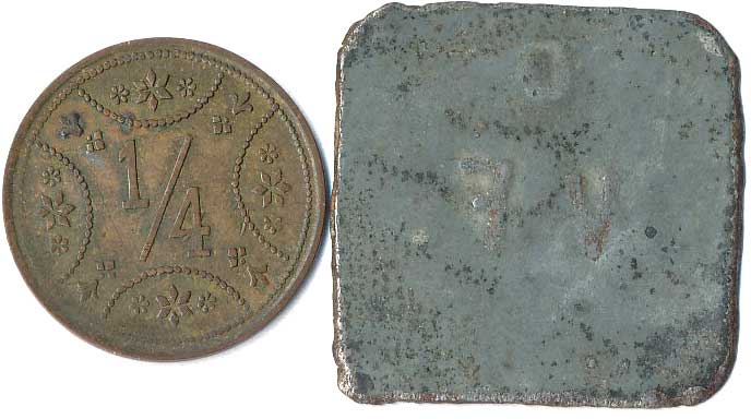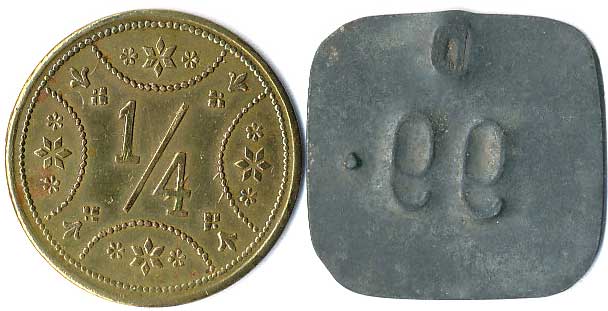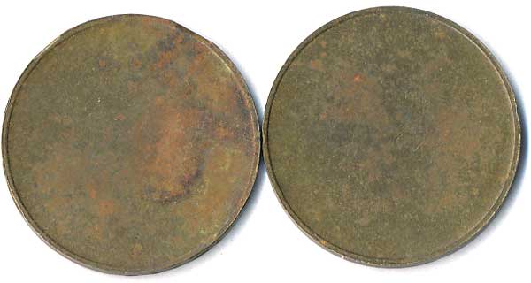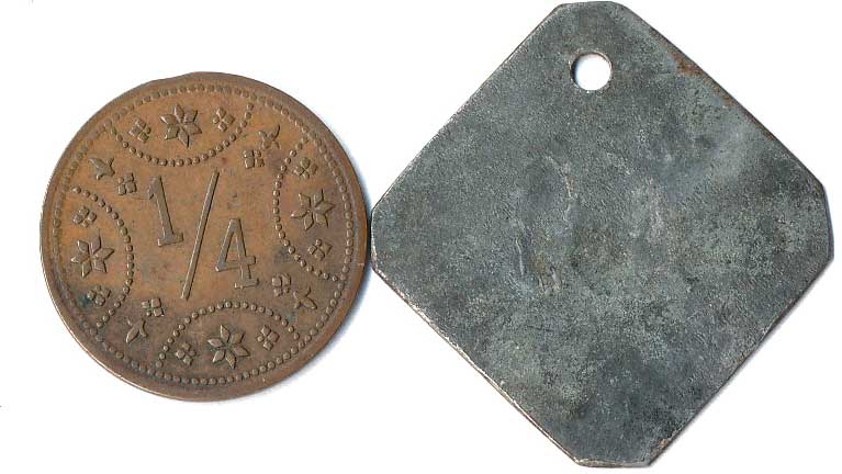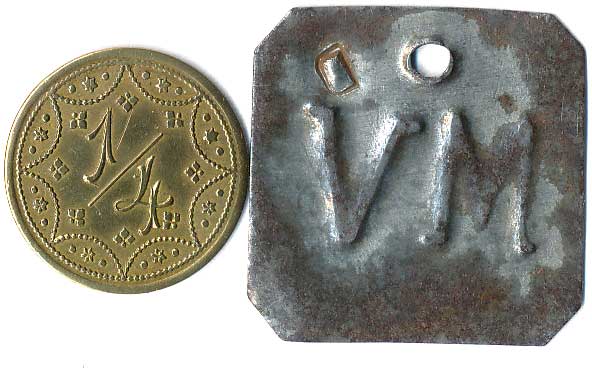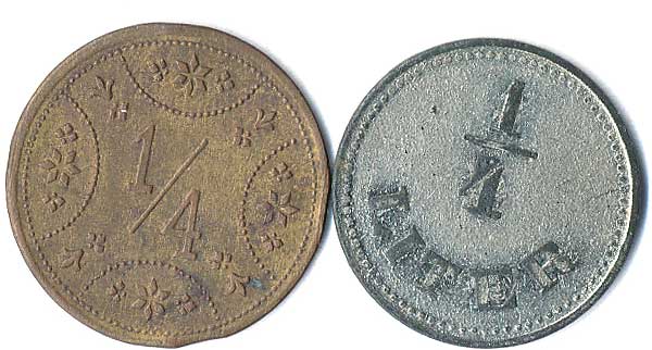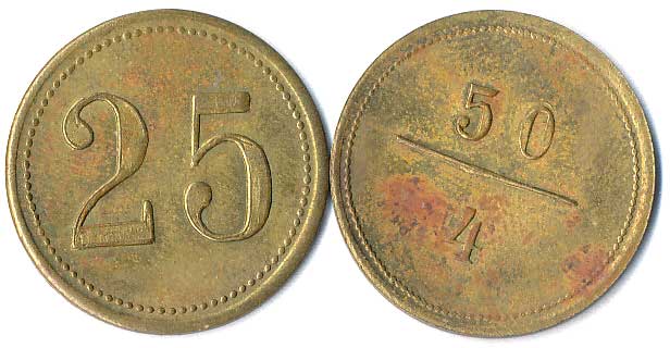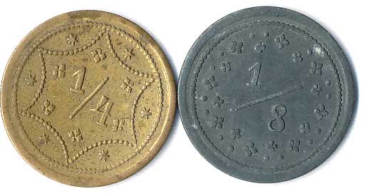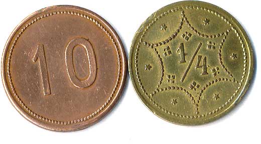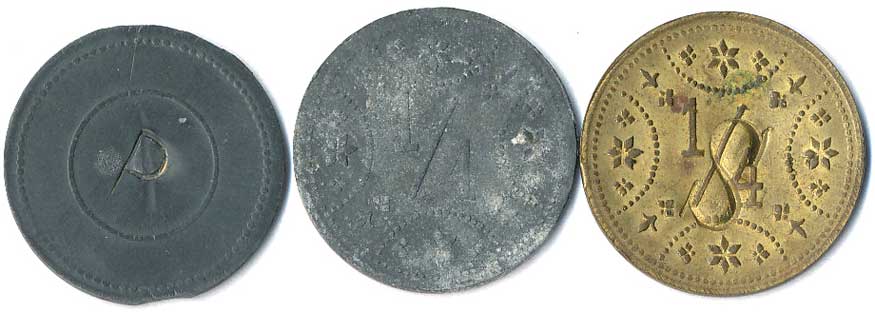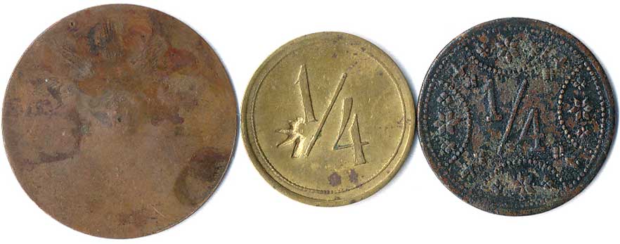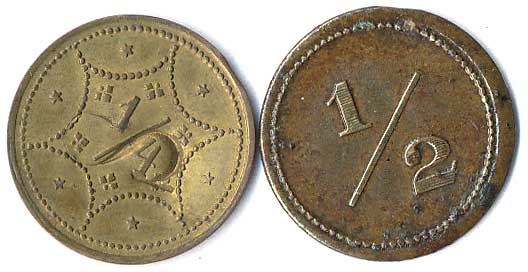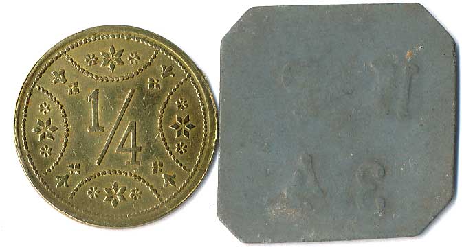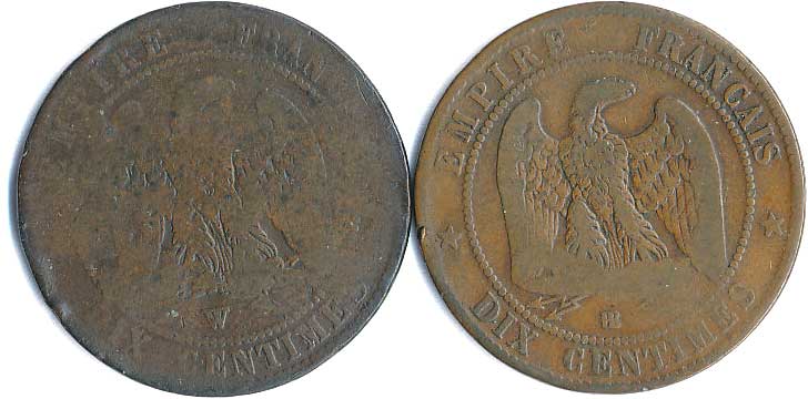 | 1111. | 10 Centimes 1863, 1857, mince přeraženy nápisem T. TURNER & Co,