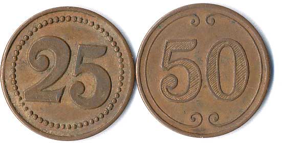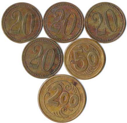 | 1140. | Hodnotové známky - 2,20,25,50,100,100, neurčeno, různé kovy a velikost, 6ks | 0-2 | 50,- | --.- |