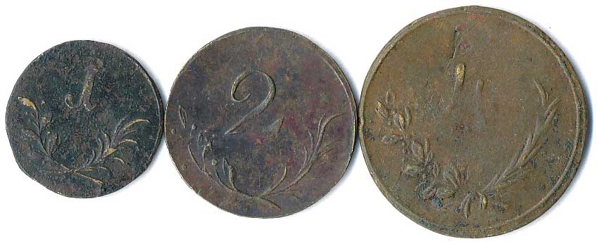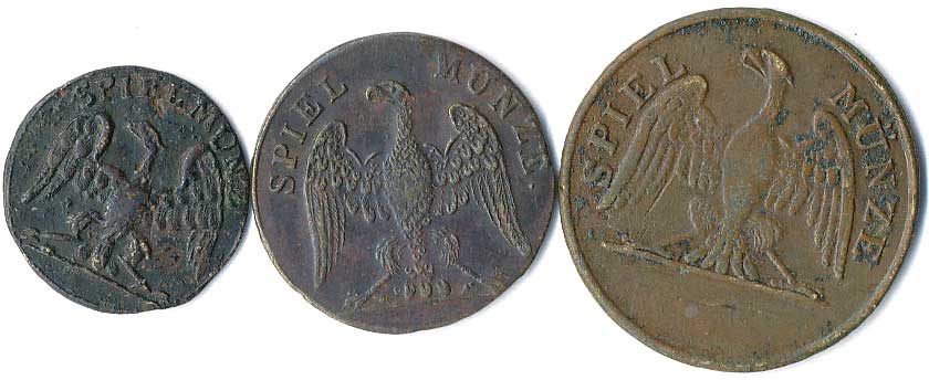 | 1121. | Německo - 3 herní mince (cca 19 stol.), orlice, opis / hodnoty 1,2,4, ŽK19-28 | 1-2 | 100,- | --.- |