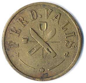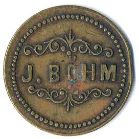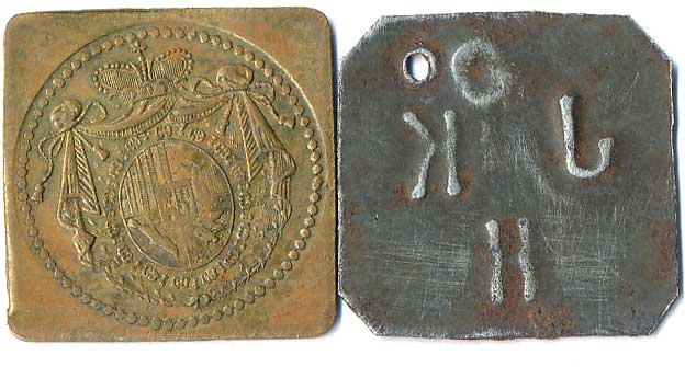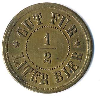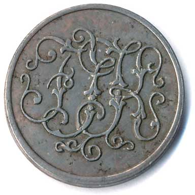 žeton do prvních plně samoobslužných bufetů, monogram FJK / nápisy, žeton z let 1896 až 1906, Fe 22, n.koroze |
