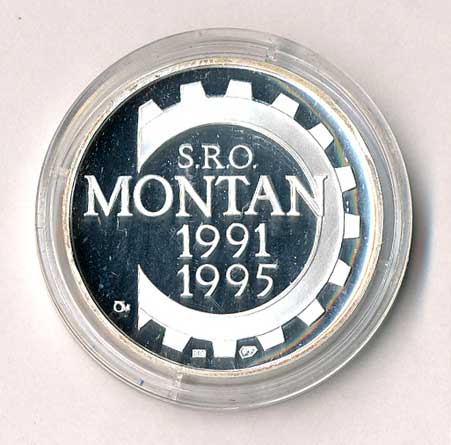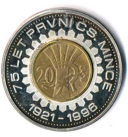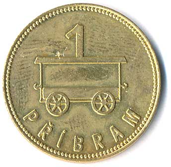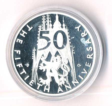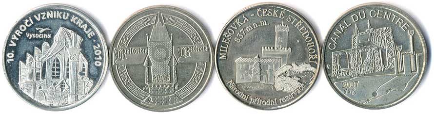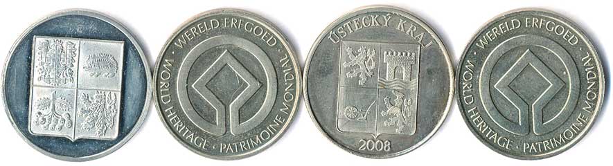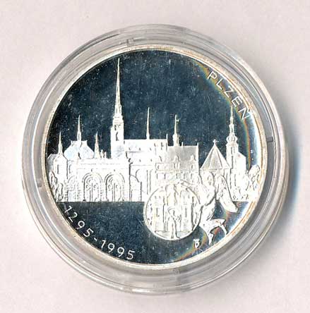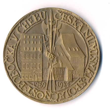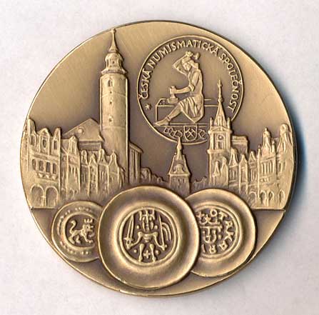 znak města, datace, opis / mince, budovy na náměstí, znak ČNS, Br50, etue,