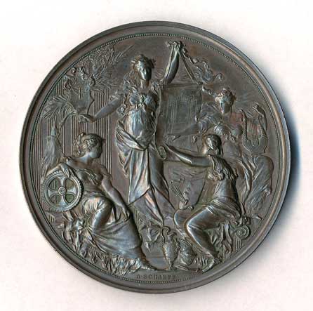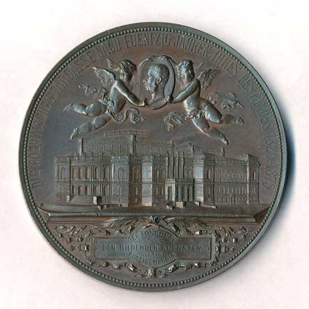 150.výročí založení - pohled na budovu, opis / stojící Viktorie držící věnnec,