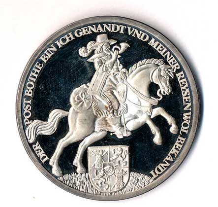1571. 500 let pošty 1490-1990-jezdec s trubkou na koni ve skoku nad erbem, opis / erb