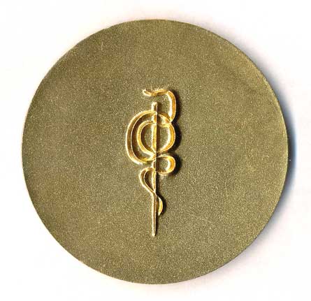 stylizovaný lékařský motiv, had s miskou, lipový list, hvězda, plíce, opis /