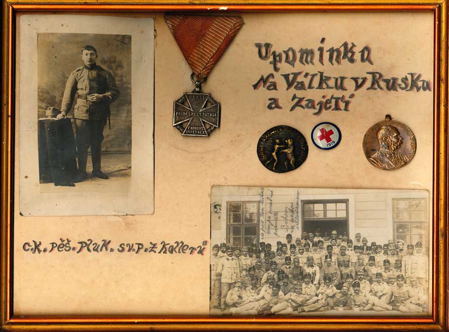 a zajetí" a "C.K.pěš.pluk sv.P.z Kollerů, fotografie vojáka, fotografie pluku, fotografie