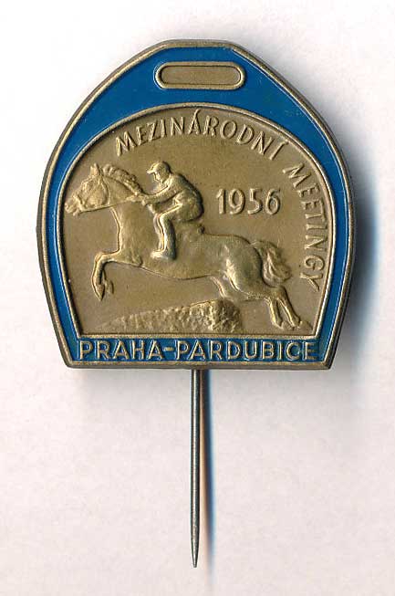 1691. Mezinárodní meetingy 1959 Praha - Pardubice - kůň s jezdcem ve skoku, plech