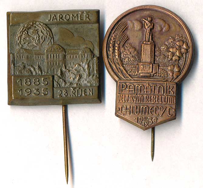28.říjen Jaroměř, 1885-1935, Br plech26x25 s jehlicí, 2ks